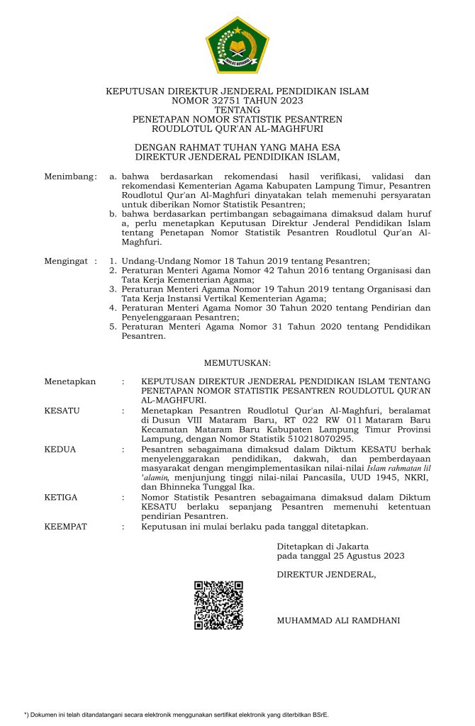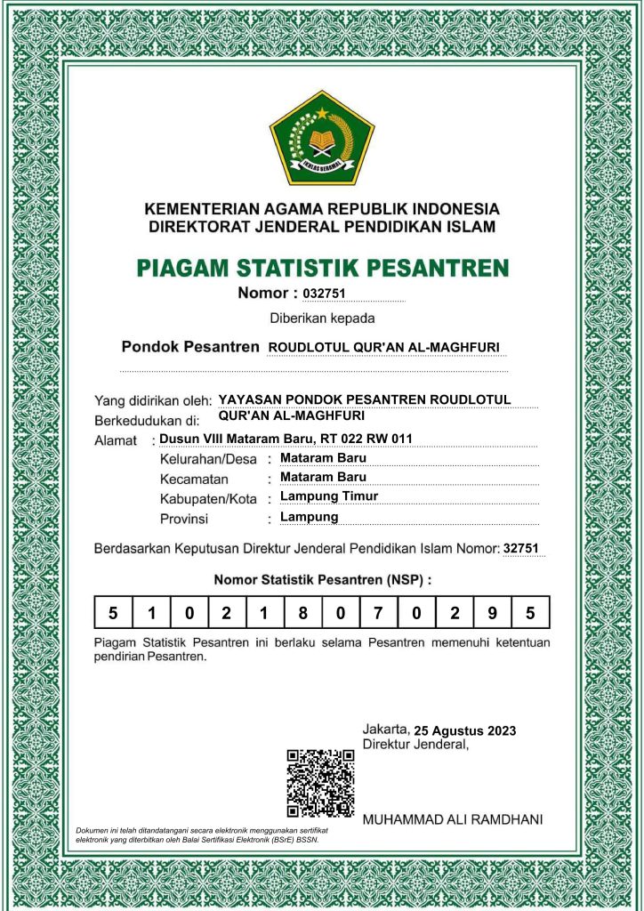 Yayasan Pondok Pesantren Roudlotul Qur’an Al-Maghfuri telah resmi berbadan hukum dan terdaftar di Kementerian Agama RI pada tanggal 25 Agustus 2023 sesuai SK dan Piagam Statistik Pesantren