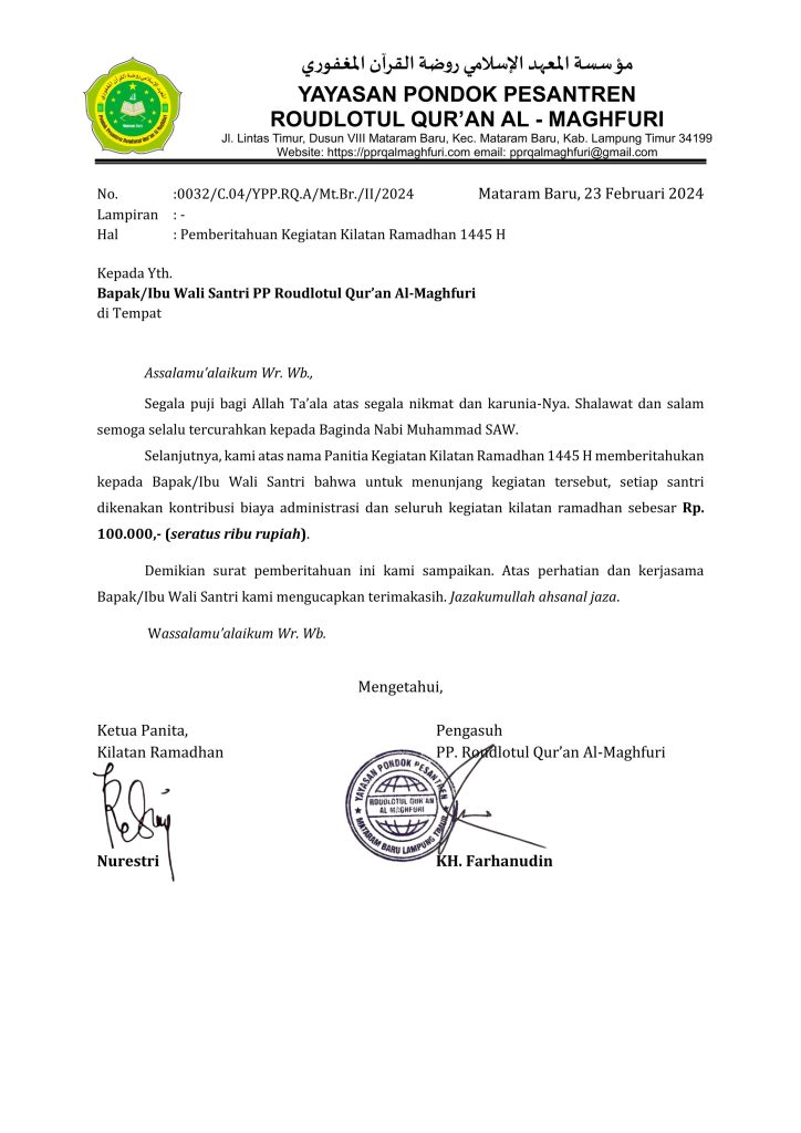 Diberitahukan kepada seluruh wali santri dan santri Pondok Pesantren Roudlotul Qur’an Al-Maghfuri bahwasanya untuk menunjang kegiatan program “Kilatan Ramadhan 1445 H” setiap santri dikenakan biaya administrasi sebesar Rp. 100.000,- . Pembayaran administrasi paling lambat tanggal 06 Maret 2024. Demikian Informasi yang dapat kami sampaikan